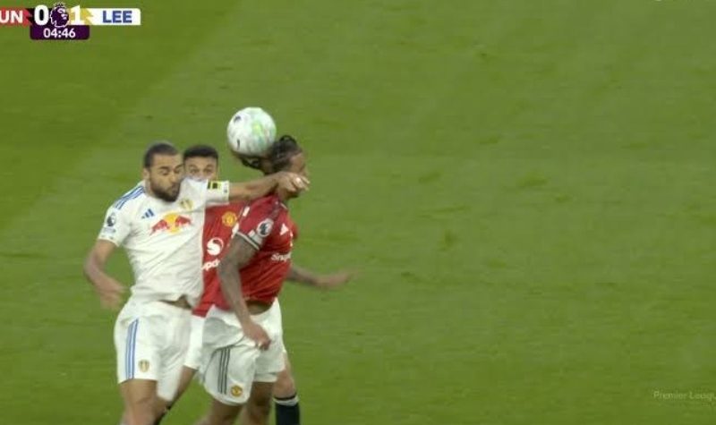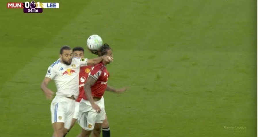 As the ball descended, a United forward leapt to meet it, eyes locked upward, body set for a header. Close behind, a Leeds defender tracked his every move. Then came a split-second interaction ripe for debate: the defender raised his arm, making contact with the United player’s face and neck. The impact was unmistakable. The attacker winced in midair, his balance thrown off as the ball glanced away.