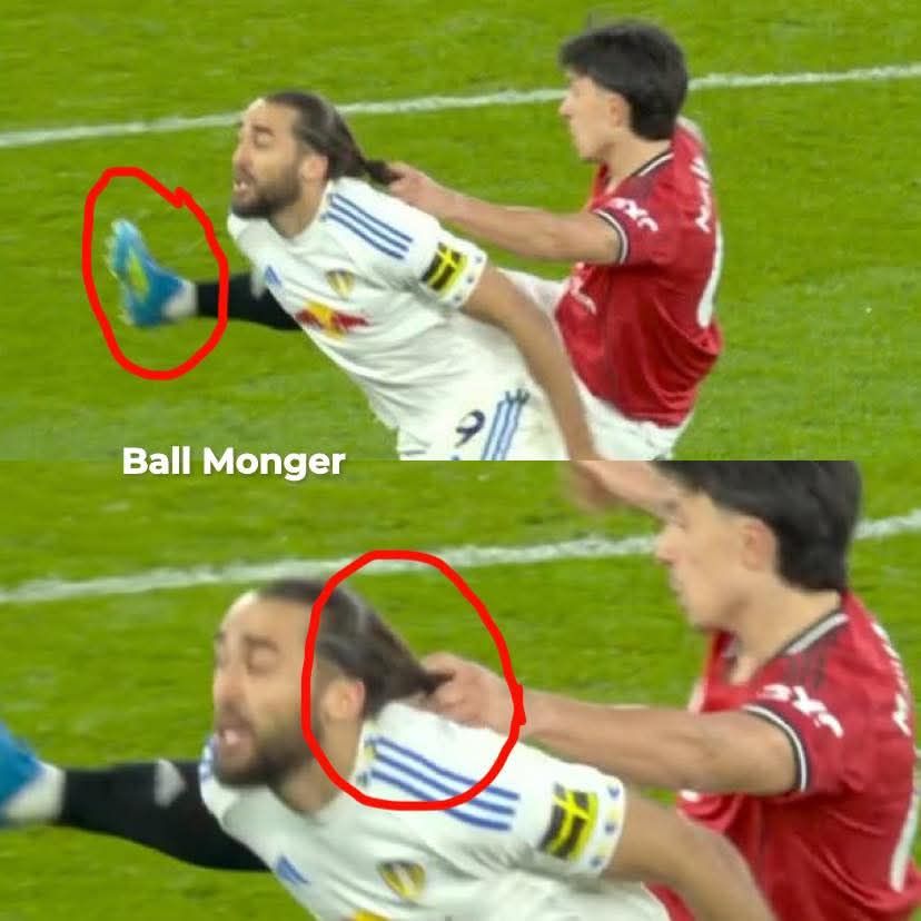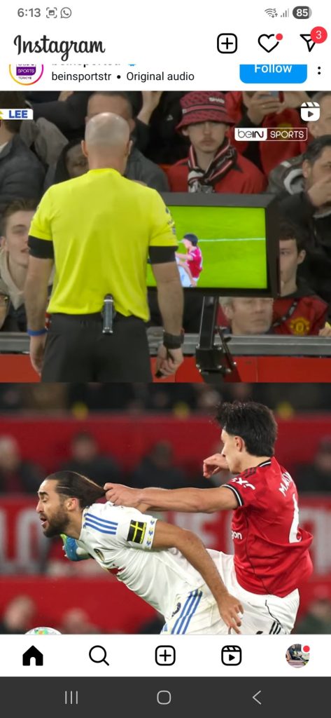 “#MUNLEE – 54′ VAR OVERTURN. After VAR review, the referee issued a red card to Martínez for violent conduct. Referee announcement: ‘After review, Manchester United 6 is guilty of pulling his hair – violent conduct. Final decision is red card.'”