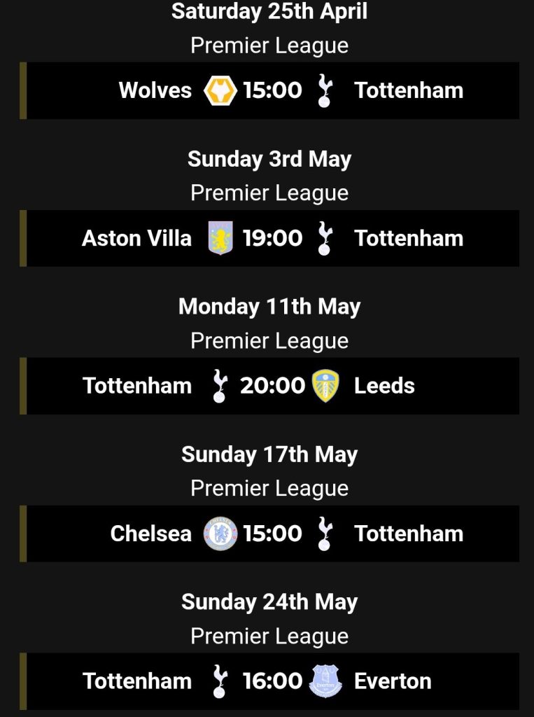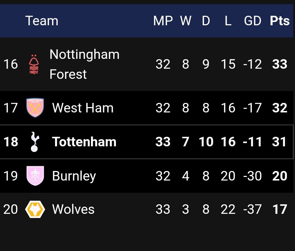 Saturday’s draw means the relegation battle remains tense for Spurs. If Crystal Palace win on Monday, Tottenham could fall four points behind 17th place. With only five matches remaining, closing such a gap would be a tall order, and Spurs will likely need results elsewhere to go their way.
