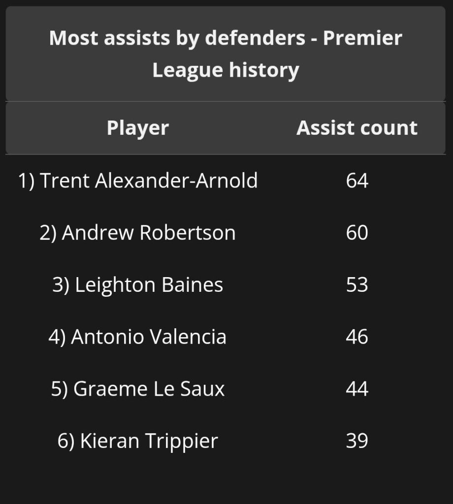 Only one defender in Premier League history has more assists (60) than Robertson—his former teammate Trent Alexander-Arnold, with 64. Robertson boasts a lethal left foot, but it’s his leadership that truly makes him a standout signing.